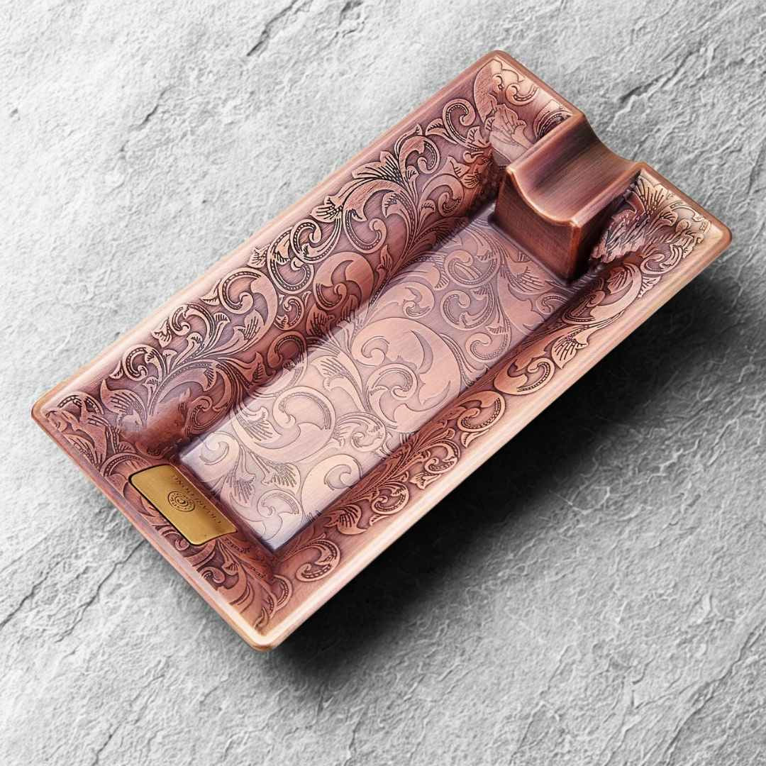 The Nomad is offered in two distinct style collections. The Carved Collection features an intricate baroque scrollwork pattern — flowing vines and floral motifs etched deep into the metal surface — available in Antique Silver, Antique Gold, and Rose Copper. The Smooth Collection presents a clean, understated aesthetic with a subtle aged patina, available in Matte Black, Antique Pewter, and Antique Bronze. Both collections share the same engineered single slot, designed to cradle any ring gauge with confidence, and a recessed ash well that contains debris with discretion.