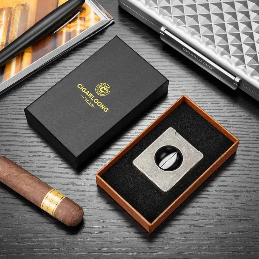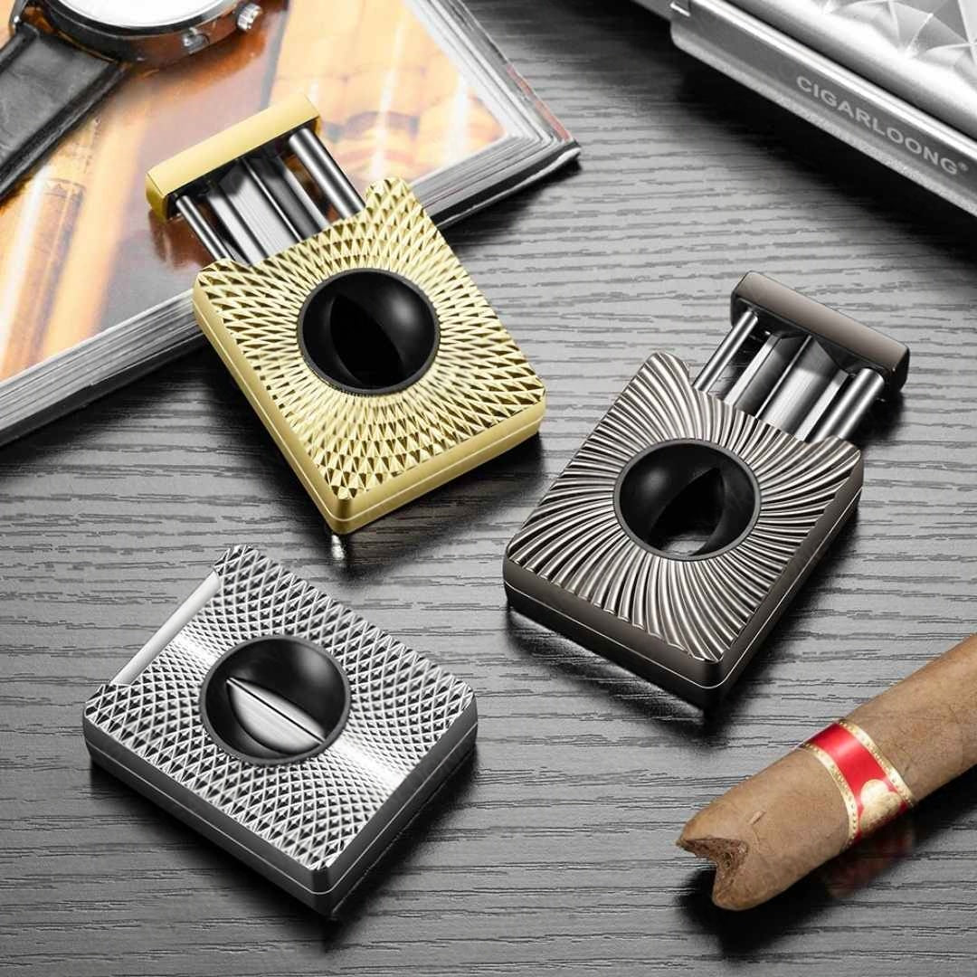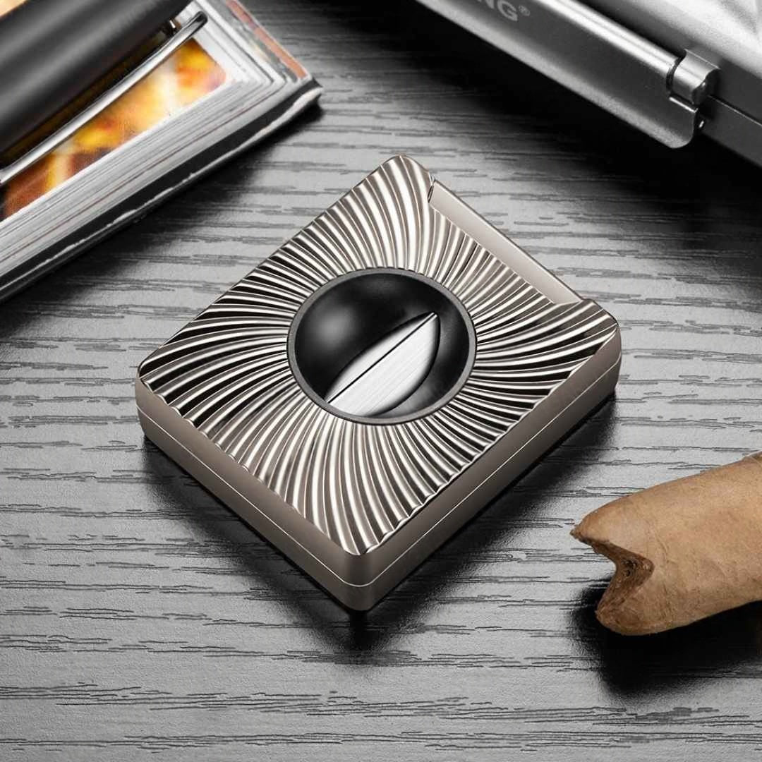 With a satisfying weight and a solid, rectangular form, the Prism feels less like a tool and more like a piece of precision machinery. Its defining feature is the one-click, spring-loaded action. A single press deploys the inverted stainless steel blade with unwavering speed and accuracy, creating a flawless wedge-shaped cut every time. The body of the cutter is a canvas for artistry, available in five distinct three-dimensional carved patterns and finishes—from the radiant sunburst to the confident diamond knurling—allowing you to select an instrument that is a true extension of your personal aesthetic. Housed in a signature Fluid And Fire gift box, The Prism V-Cutter is a statement of intent for the serious collector.