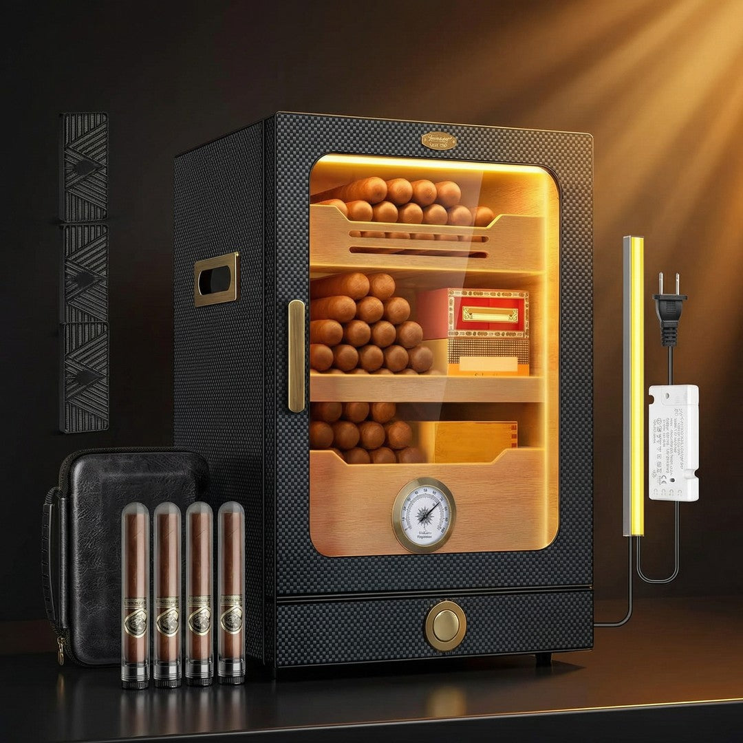 • Specifications: Dimensions: 11.02" W × 9.72" D × 15.83" H | Weight: 11.25 lbs | Capacity: 100–150 cigars | Humidity Range: 65–75% RH | Includes: 3 humidifiers, 1 dropper, LED strip with power adapter, leather travel case, 4 acrylic cigar tubes with humidifier caps.