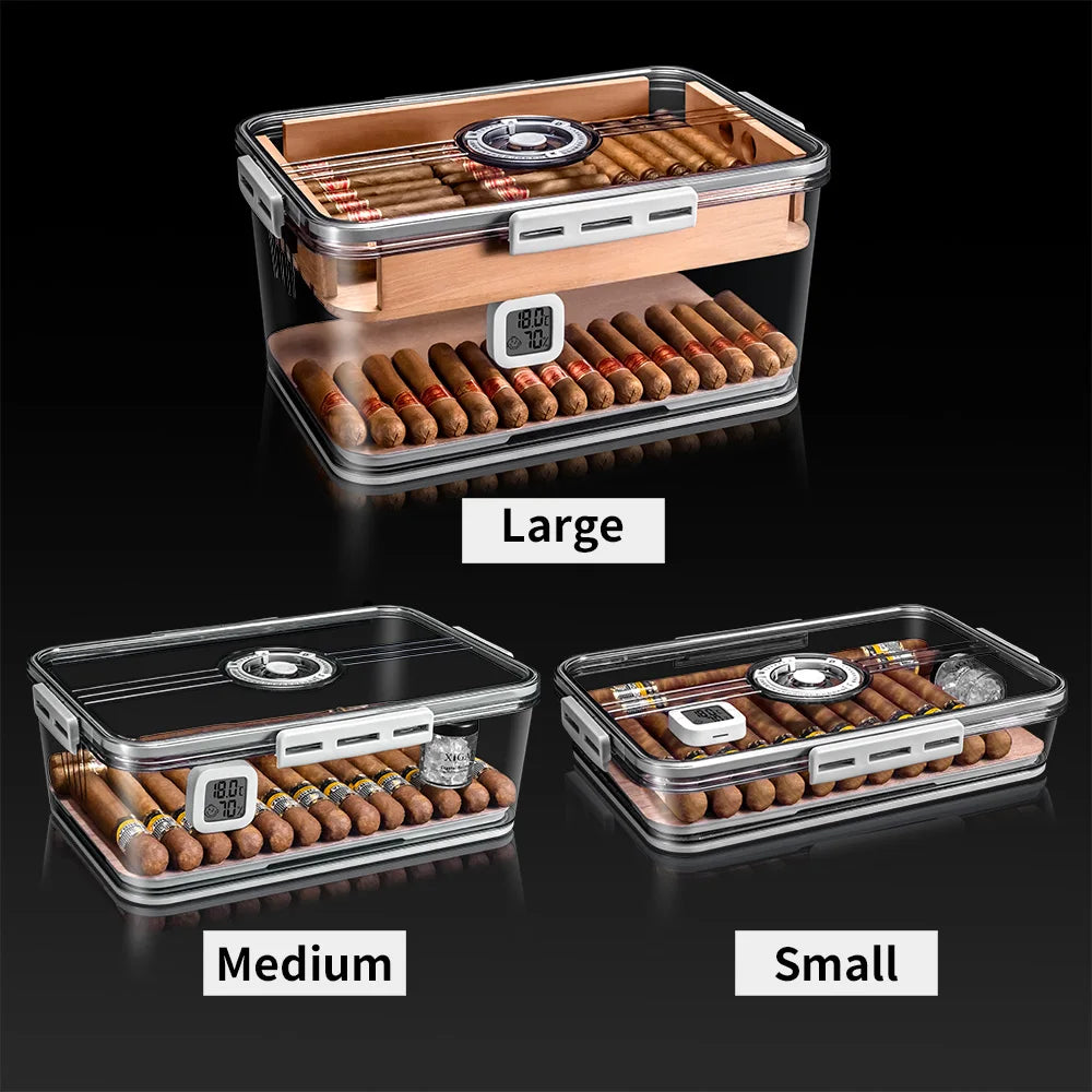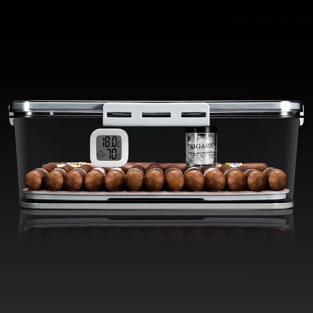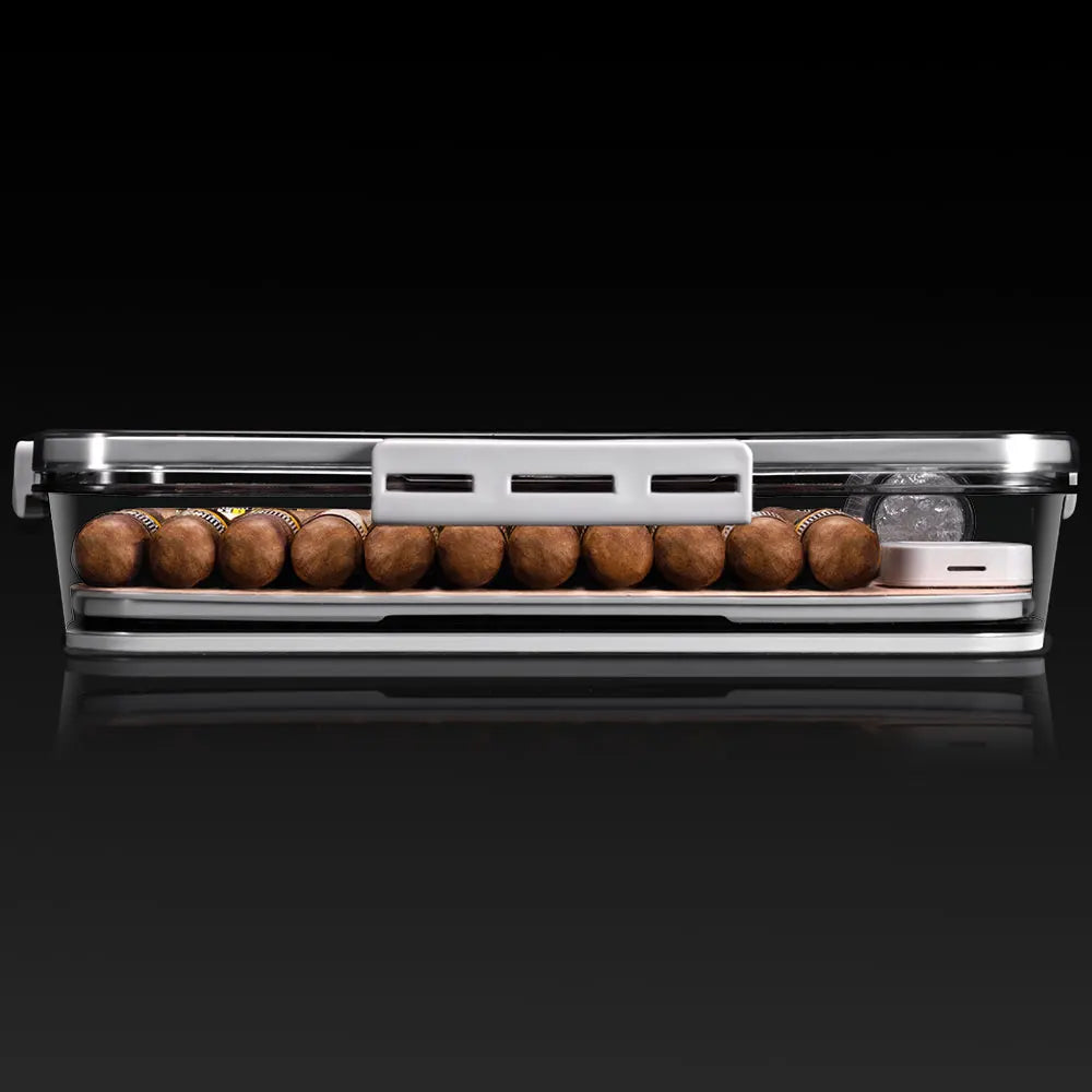 • Crystal-Clear Panoramic Display - The humidor is constructed from a durable, transparent, food-grade PP material, offering a 360-degree view of your collection while keeping it perfectly sealed from the elements.