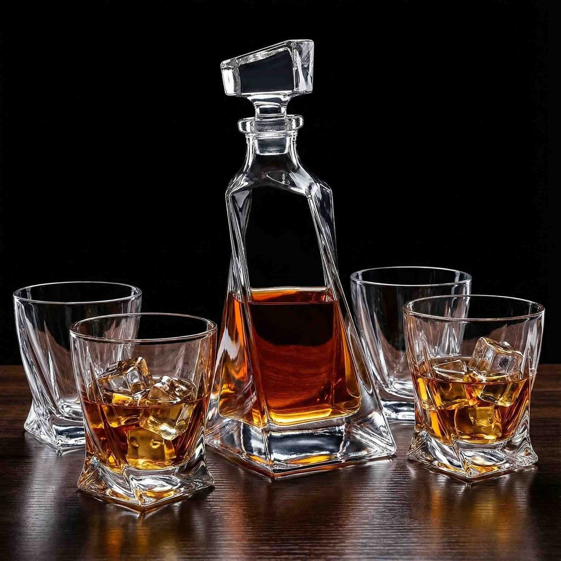 A Masterpiece of Form and Light. Handmade by expert artisans, each piece in this stunning five-piece set features a unique, asymmetrical twist—a dynamic, geometric form that seems to lean into the future. As light moves through the flawless, non-leaded crystal, it creates a dazzling display, illuminating the rich, amber hues of your spirit in a way that a traditional decanter simply cannot. The heavy glass stopper provides a satisfying seal, preserving the integrity of your finest whiskey, while the matching tumblers feel confident and balanced in hand.