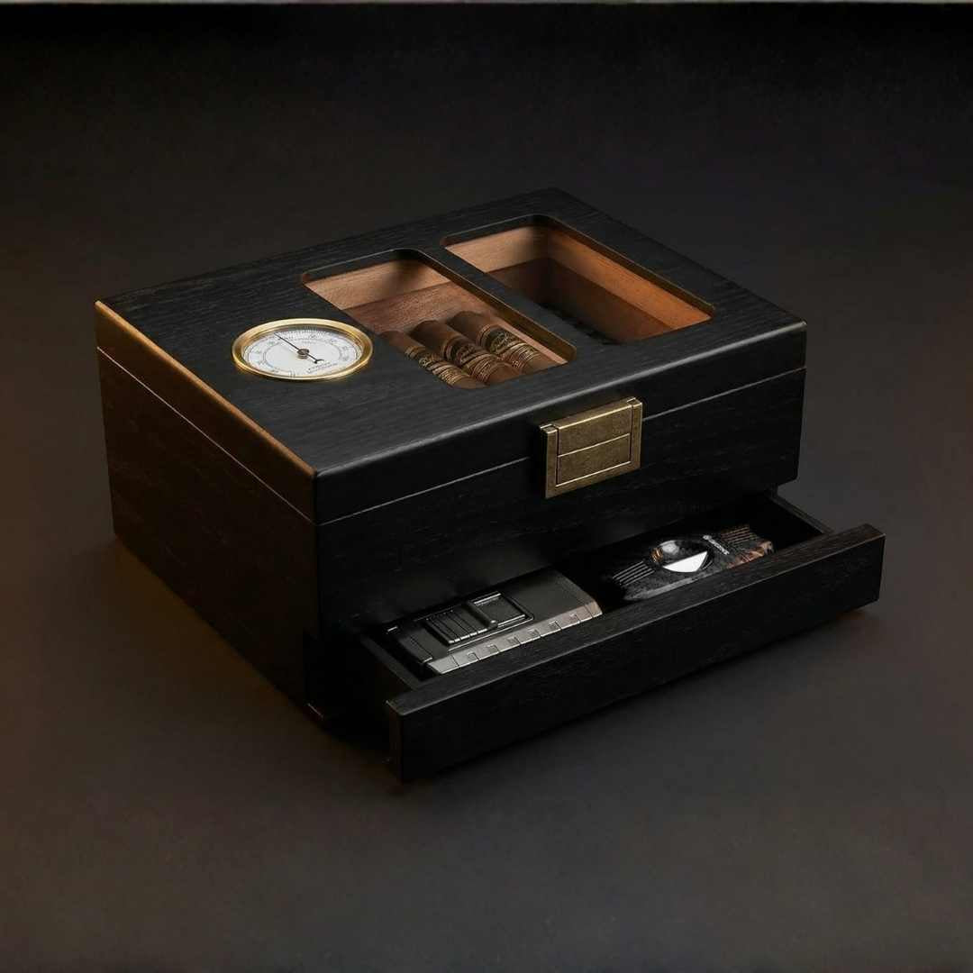 Raffiné dans les moindres détails, le coffret Oculus est conçu pour ceux qui considèrent l'art du cigare comme un rituel. Habillé de cèdre espagnol de qualité et surmonté d'une vitre en verre trempé d'une clarté exceptionnelle, cet humidificateur de bureau est bien plus qu'un simple rangement : c'est l'expression d'un goût raffiné et d'une exigence de qualité.
